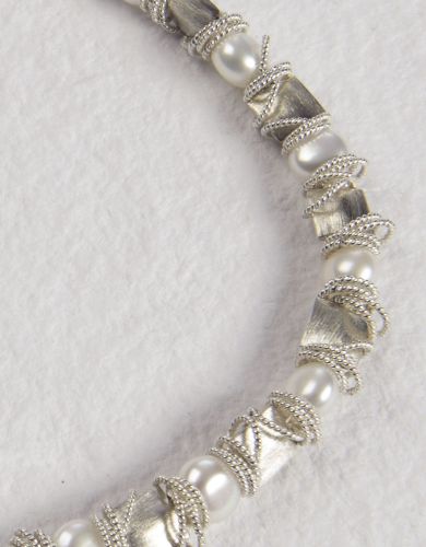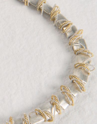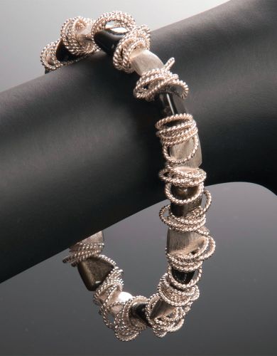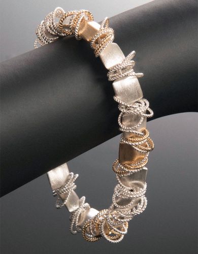Rich and textural. A dynamic arrangement of brushed and twisted sterling silver pillows and rings. Also available with accents of gold vermeil and gemstone options. All styles available in necklace and bracelet lengths.